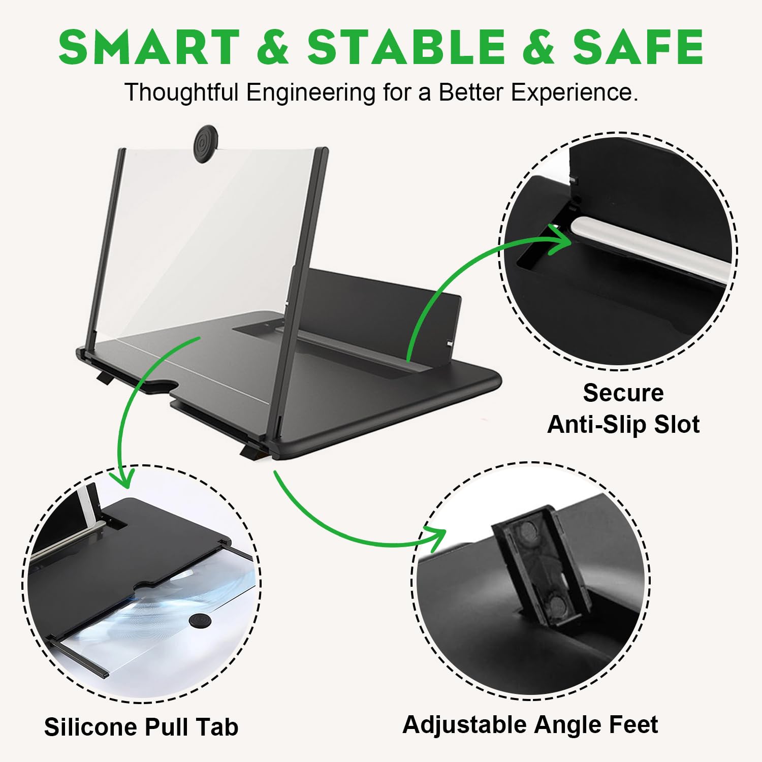 STABLE, SAFE & ADJUSTABLE VIEWING: Engineered for a secure experience, every magnifier features an anti-slip phone slot to prevent your device from falling. The adjustable feet at the bottom allow you to find the perfect viewing angle for maximum comfort and stability on any flat surface.