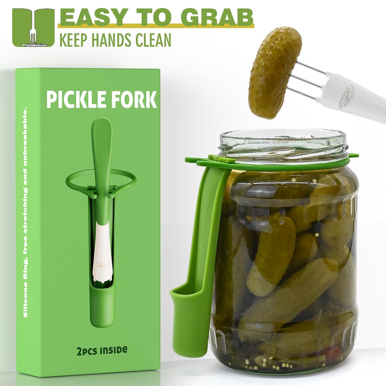 Best kitchen gadget! We are a big pickle family and it’s so annoying to have to get a fork out every time you want a pickle and clean it. This wraps around any size pickle jar. Spears are sharp, sturdy and puncture pickles easily. Easy to take off and clean. Comes with extra elastic wraps in case they break.
