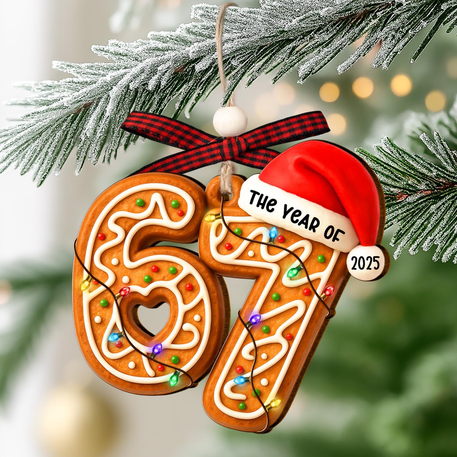 • πŸͺ΅ HANDMADE WOODEN ORNAMENT – LIGHTWEIGHT CHRISTMAS DECORATION This single-layer handmade Christmas ornament is crafted from quality wood and printed with a vibrant gingerbread 6 7 design. Lightweight yet sturdy, it’s perfect for any Christmas tree decoration, wreath, or garland. With smooth finish, festive colors, and a built-in plaid ribbon, this wooden 67 ornament adds charm to your space – ready to gift or hang right away.
