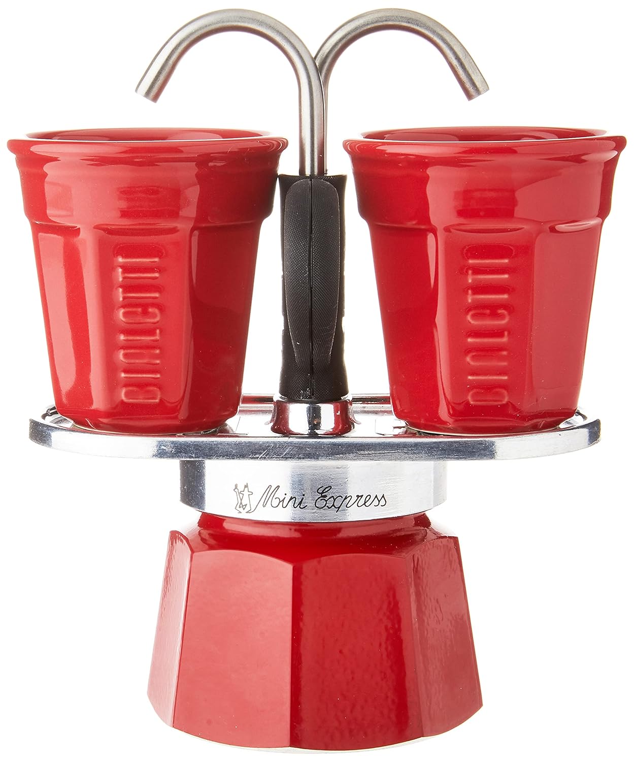 This unmistakable red Bialetti Mini Express features a support plate and two matching Bialetti-branded espresso cups