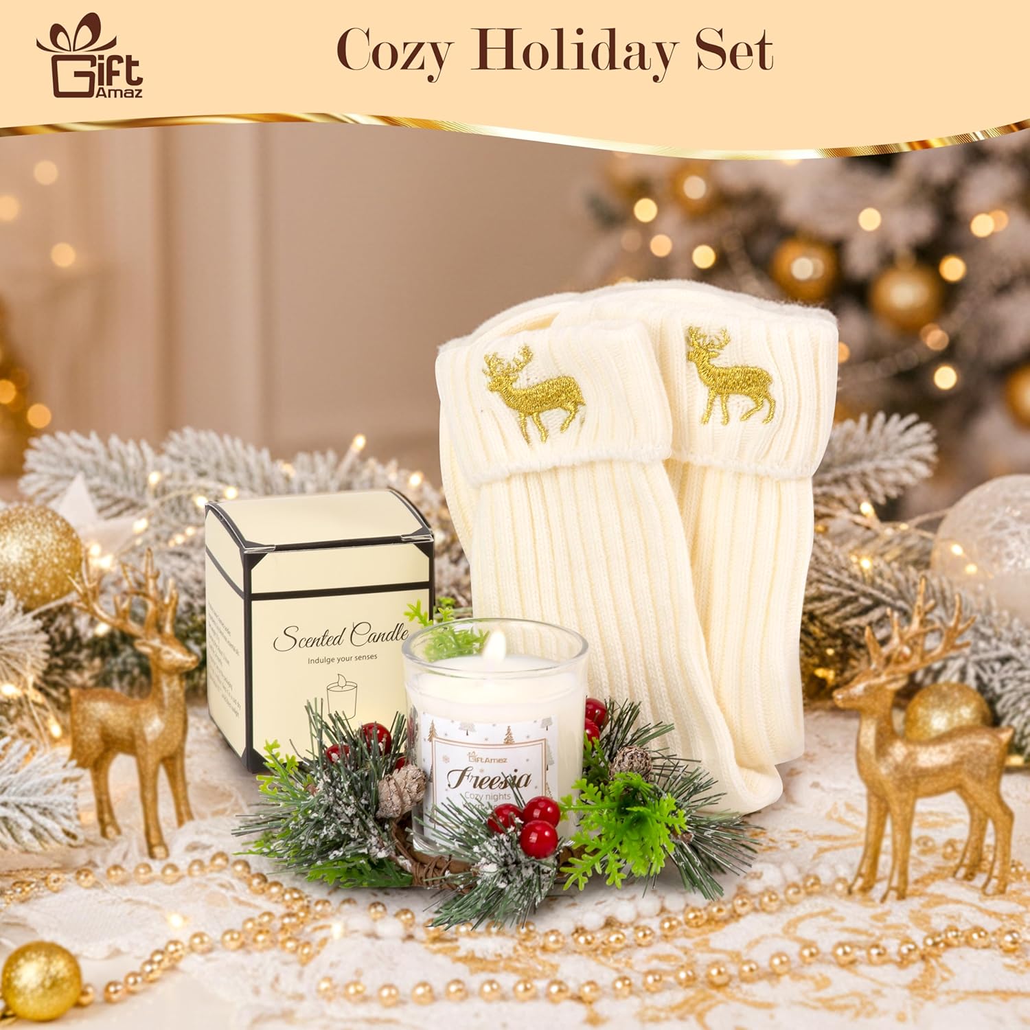 • SELF CARE PACKAGE KIT: We’ve thoughtfully assembled everything for a cozy Christmas. The set includes a Christmas tree element pillowcase, a double-layer glass with Christmas tree pattern and colorful sequins inside, a small freesia-scented white candle, a pair of warm socks with golden elk embroidery, a pair of snowflake earrings, a golden elk headband, a mini wreath, and a Christmas card—with a ready-to-tie ribbon and bow on the box for the wonderful Christmas