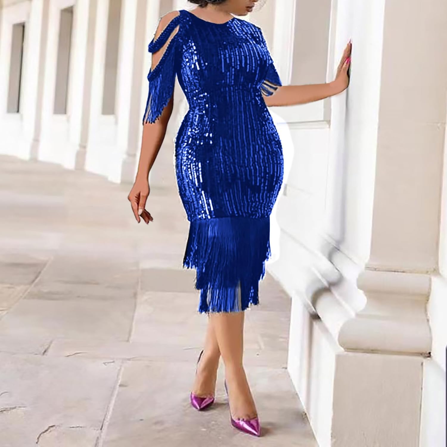 10 reviews for Cololura Elegant Women Sequin Short Sleeve Tassel Bodycon Midi Dress Party Evening Gown Formal Dress
