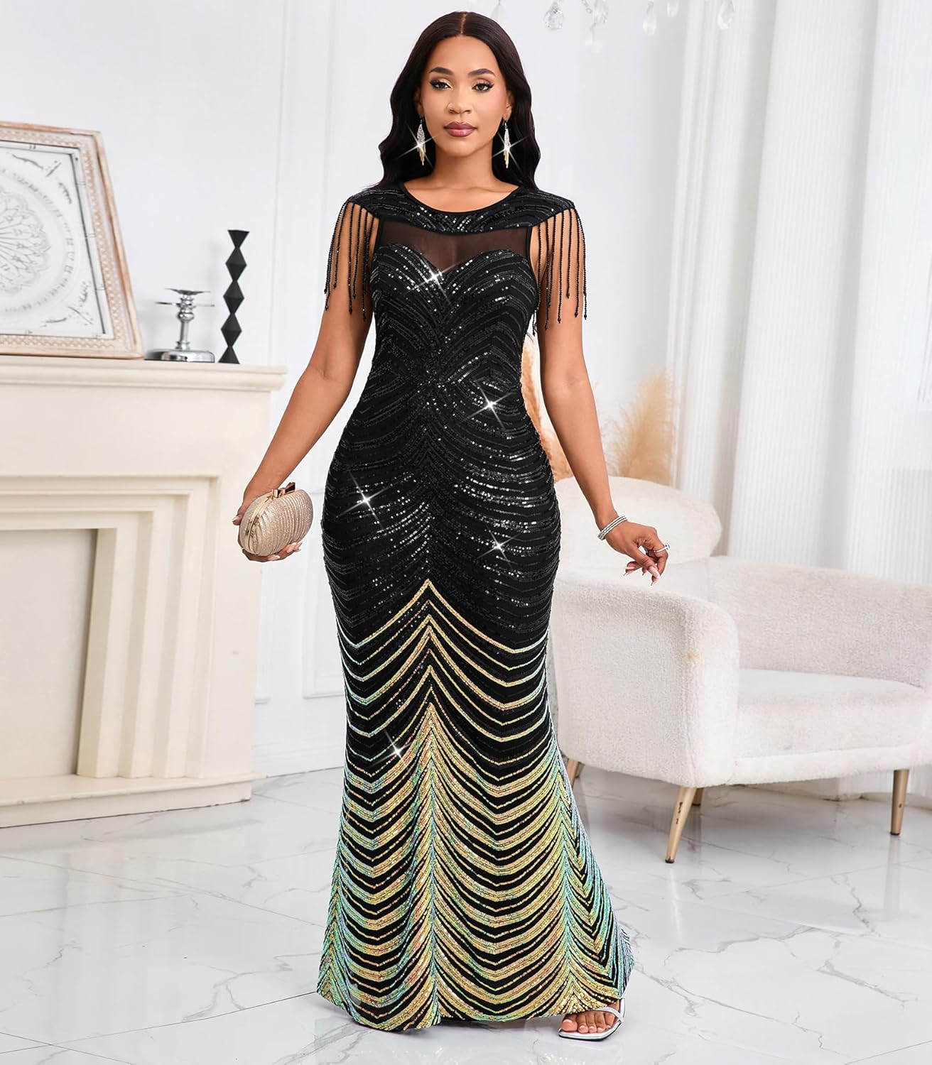 【Design】: Sequin for women designed with elegant tassel, perspective sheer mesh on your chest, Artfully placed gold threads create dimensional shimmer under lights, makes you more sexy and attractive, hips-wrapped, maxi Length, the bodycon dress for women will make you many compliments at the party. More than a dress – it’s your secret weapon for every ‘make them remember’ moment.