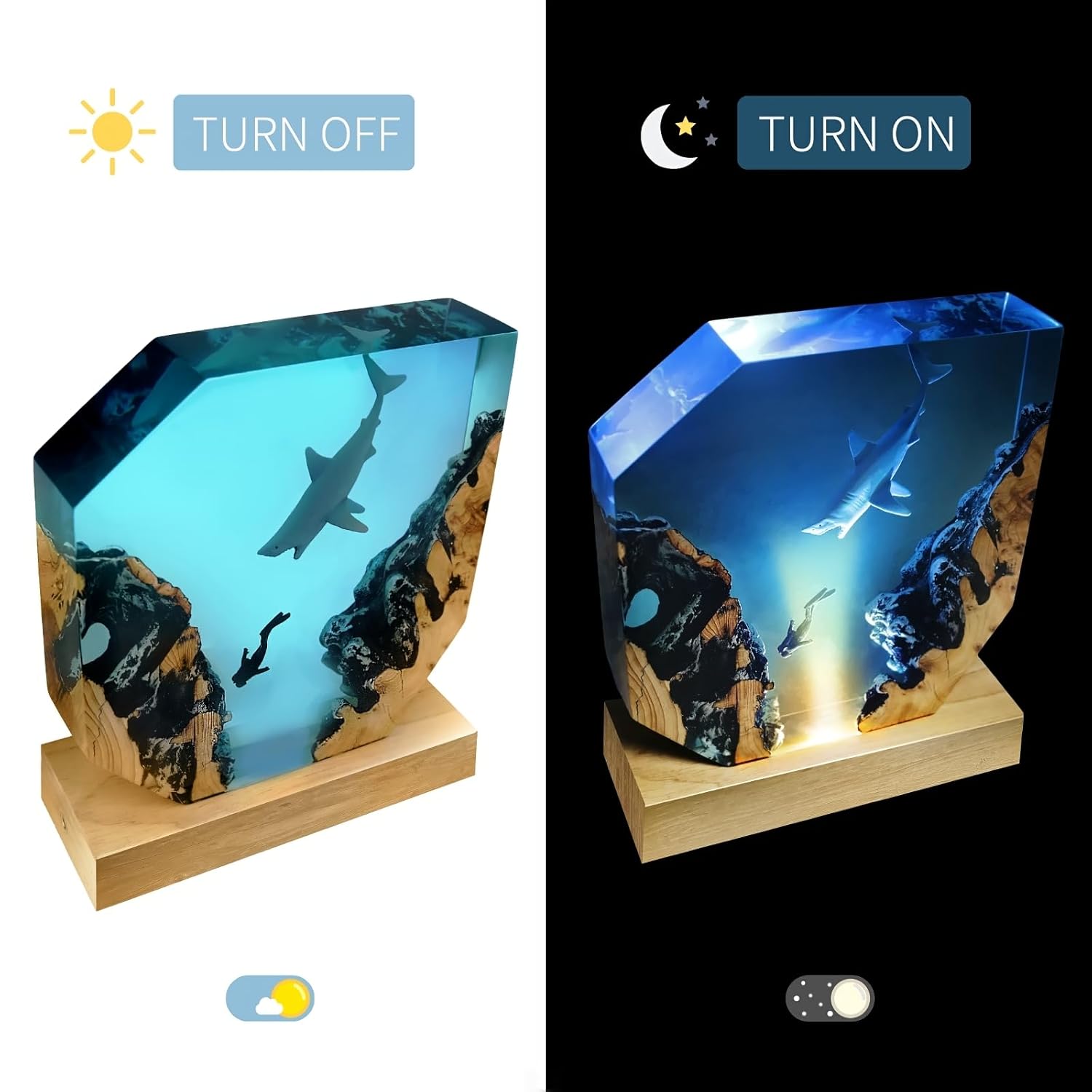 Epoxy resin desk art ornaments: Artistry items, lamp bases may vary from batch to batch. This cool decor suitable for desks, bedside, living room. Beautiful, illuminated to showcase diver & shark scene.