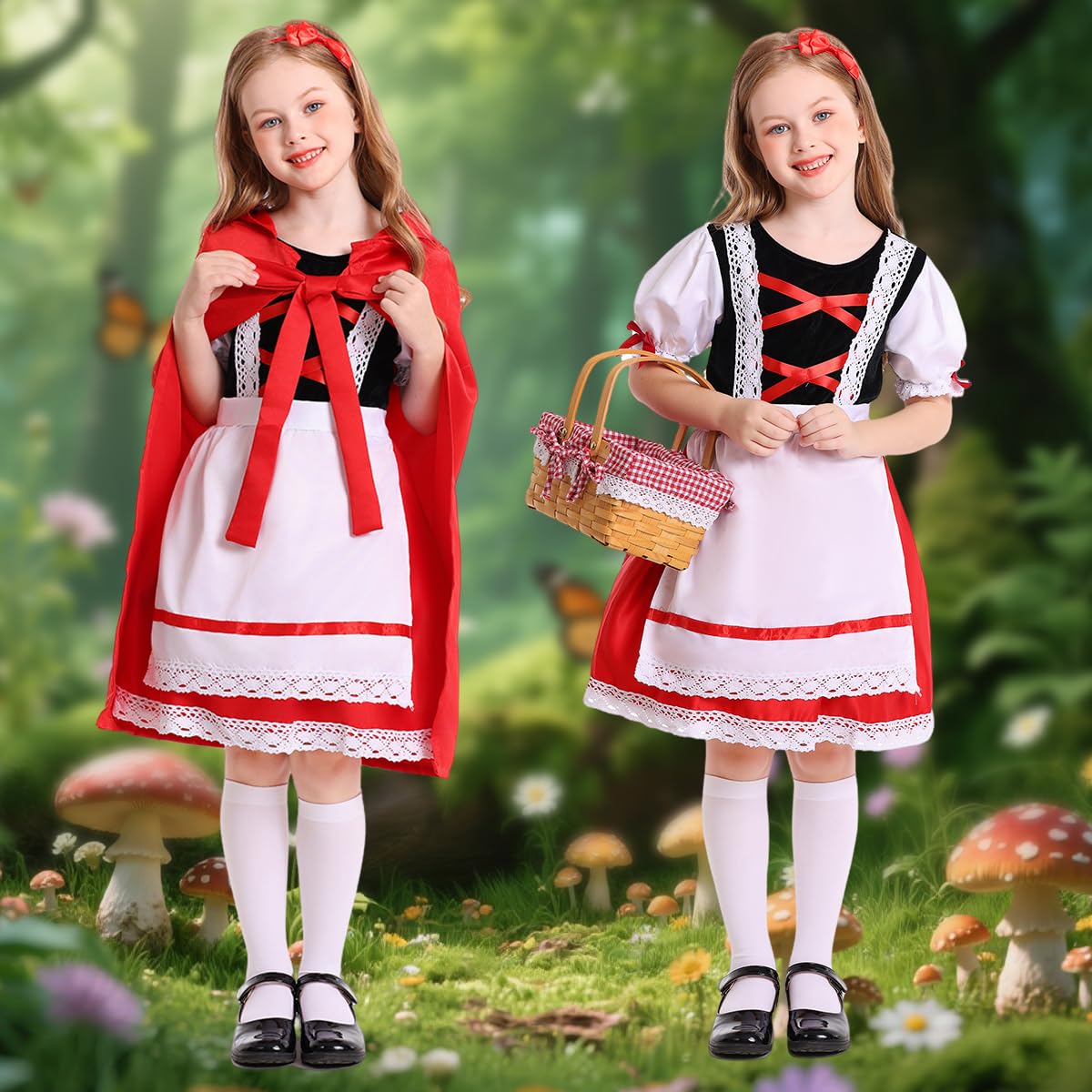 👗 Complete Storybook Outfit: The kids book character costume set includes a charming short-sleeved dress with an attached apron, a signature red hooded cape, cozy white knee-high socks, and a sweet woven crossbody bag with cherry details