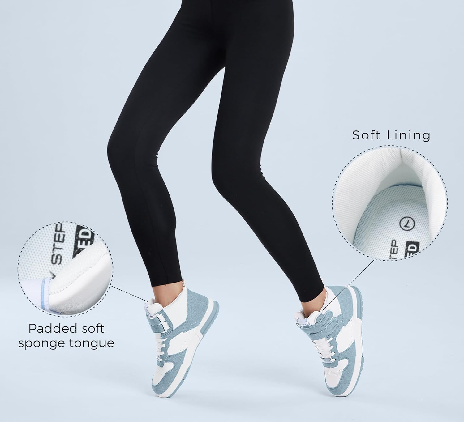 Lucky Step shoes are super comfortable for me in all the styles that I have purchased! These high tops are light, airy, and feel broken in from the moment I put them on my feet. The only problem I’ve had is deciding which color to keep for work purposes only. Haha I have 3 pairs and as soon as I open the box, I think “Ohhhhh, these are too cute for work!” I actually work in a Memory Care facility, so I keep my work shoes separate from my personal use shoes. I just bought all white, but have decided to wear my all black for work even though the blue halogram is tempting…dang! I walk a lot, between 8-10 miles 4-5 days a week and Lucky Step has helped make that possible while keeping a smile on my face. They are well made, slip resistant, nostalgic, and cute! The heel height is perfect for my regular wardrobe, and also my Scrubs. I wear a size 8 in all sneakers, and this brand has not let me down even in the low tops. I haven’t experienced any tearing in the Velcro area as some have mentioned , but did have a slight annoyance with some tongue slippage in the beginning. That was easily fixed by bringing the laces up under the Velcro, and crossing each lace through the logo tag. I then affix the Velcro an let the laces hang loose over the top. I can still slip them on and off easily that way. Very happy with these shoes!