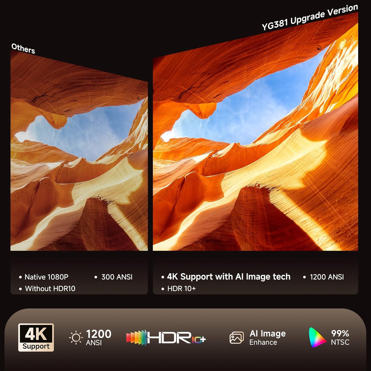 [AI-Powered Visuals–1200ANSI | 4K Support & HDR10+] The iSinbox YG381 outside projector delivers 1200 ANSI lumens of brilliant 4K HDR10+ visuals with AI-powered image optimization, achieving 98% NTSC color accuracy for truly lifelike outdoor movie nights. This versatile proyector functions equally well as a ceiling projector for home theater setups or portable outdoor entertainment, featuring eye-care technology that reduces blue light for comfortable extended viewing. Whether mounted or mobile, this all-in-one home projector brings cinematic color and clarity anywhere.