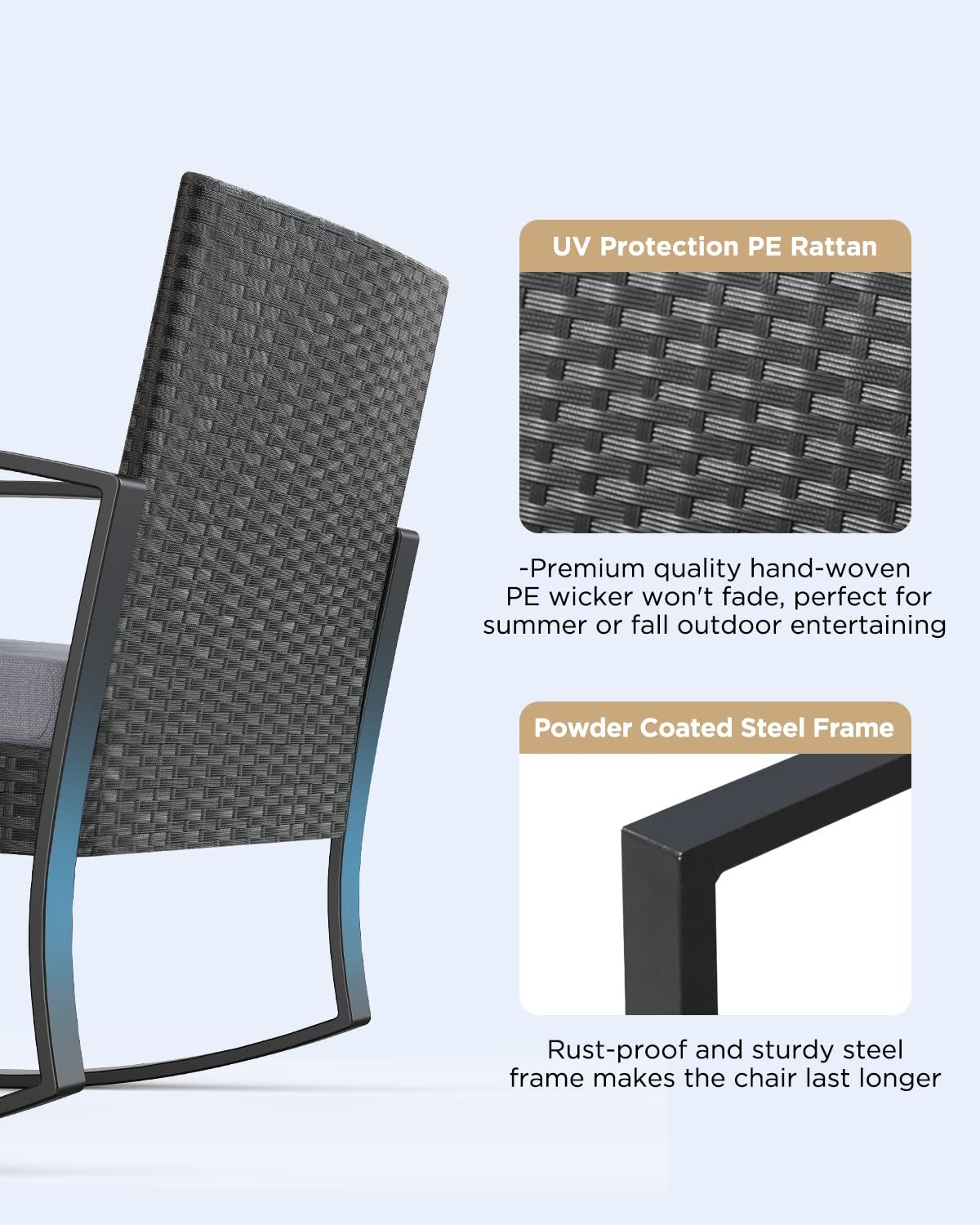 Specification: 3 Pieces Outdoor Patio Furniture Set Rocking Bistro Set Outdoor Rattan Conversation with Coffee Table for Garden Balcony Backyard Poolside (Grey Cushion)