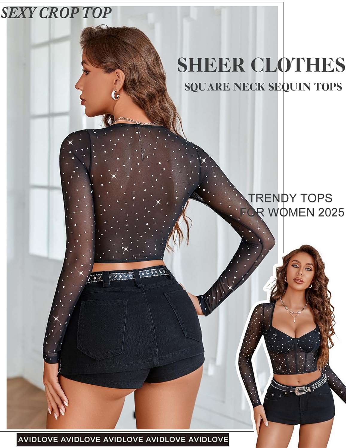🌺【Elegant Design】Avidlove mesh top features long sleeve, see through mesh material, cut out, square neck, with sequin, give it that extra interest factor and sexy. Slim fit design shows your perfect figure.