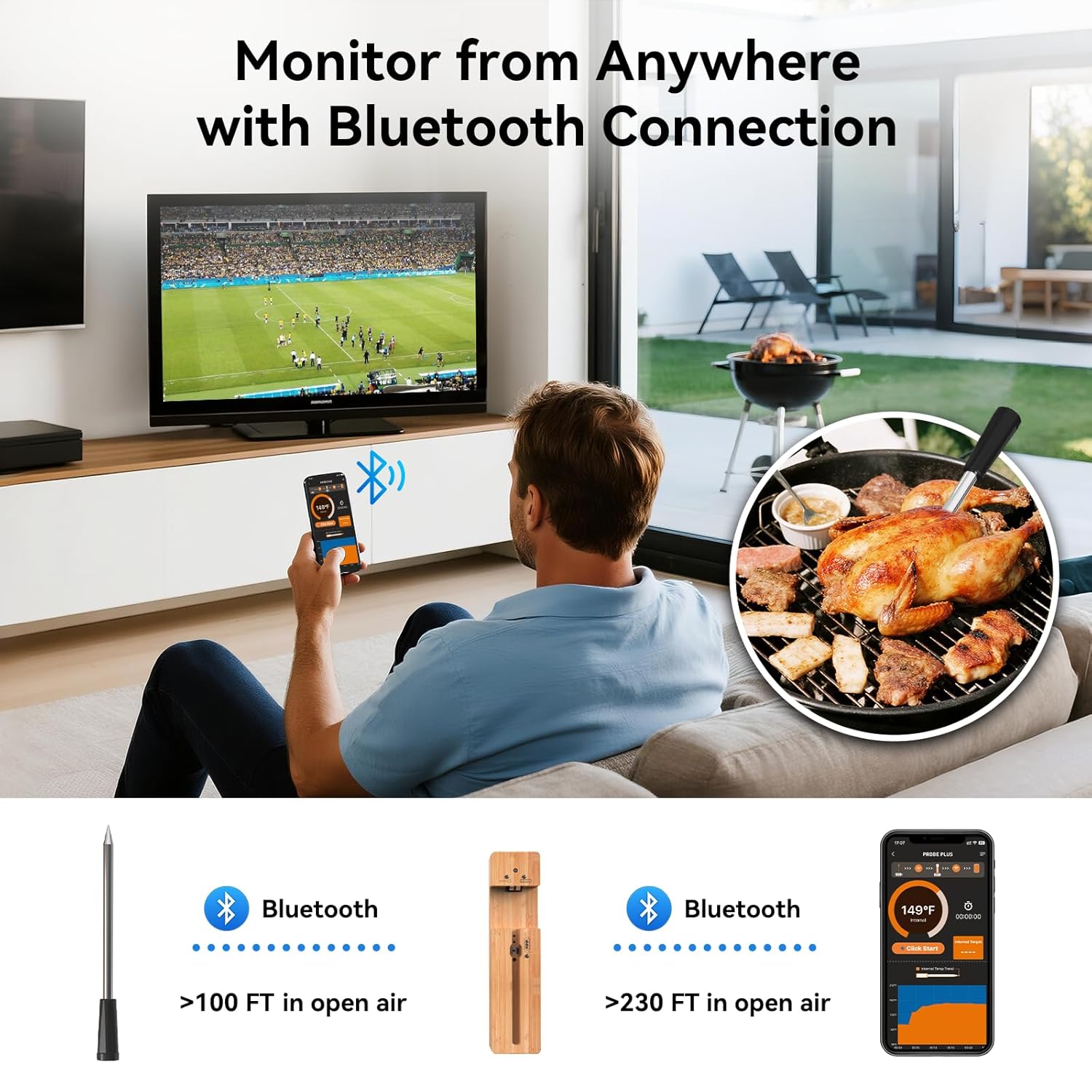 Smart Wireless Meat Thermometer with Long Range: This wireless meat thermometer uses Bluetooth connection technology. Monitor grills, ovens, or smokers from up to over 230FT away! The probe connects wirelessly to the base, which then relays precise temperatures to your phone via Bluetooth, giving you ultimate freedom to entertain or relax indoors