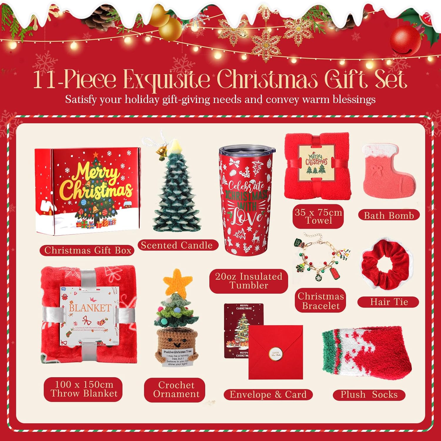 AMAZING CHRISTMAS GIFT SETS FOR WOMEN: Our Christmas gift sets featuring 20oz stainless steel tumbler with the words “Celebrate CHRISTMAS WITH Love”, Christmas themed throw blanket, festive red towel, plush tree socks, Christmas cedar scented candle, soothing Christmas sock shaped bath bomb, Christmas tree crochet ornament, Christmas themed bracelet, red and white hair tie & Christmas tree shaped card. All this women gift sets Christmas is carefully sealed in a “Merry Christmas” luxury and durable Christmas gift box