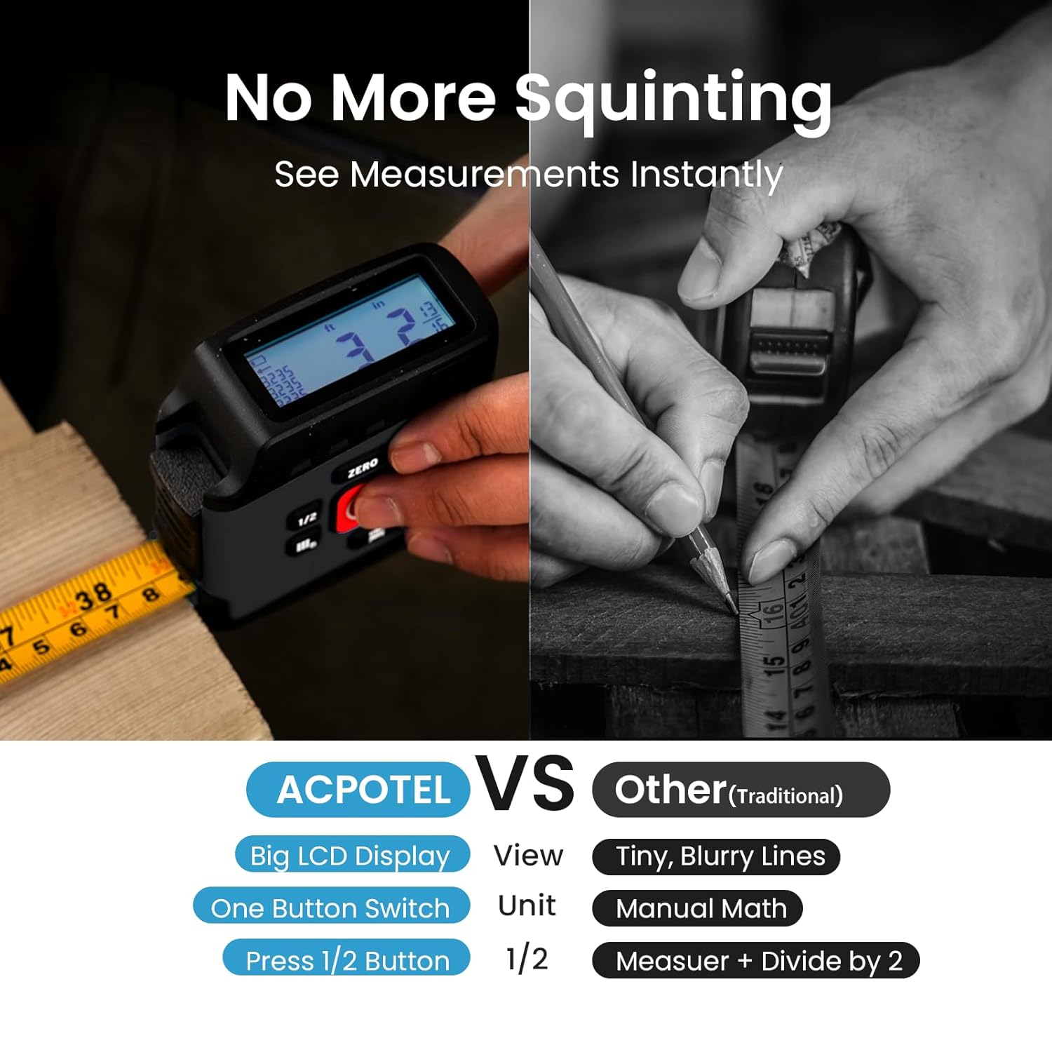 DATA SYNC DISPLAY TECHNOLOGY – The DT20 Digital Tape Measure is the world’s most productive tape measure delivering fast, accurate, and forget-free measurements with robust digital measuring technology. With ACPOTEL’s patented PowerBrust Digital Display technology, real-time precise figures are displayed on the screen when you pull out the measuring tape, FAST & ACCURATE