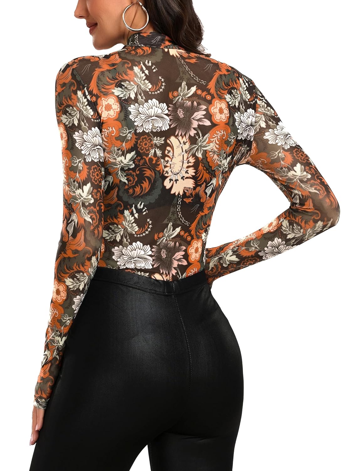 Floral Mesh Long Sleeve Tops for Women Mock Neck See Through Fitted Sexy Going Out Top