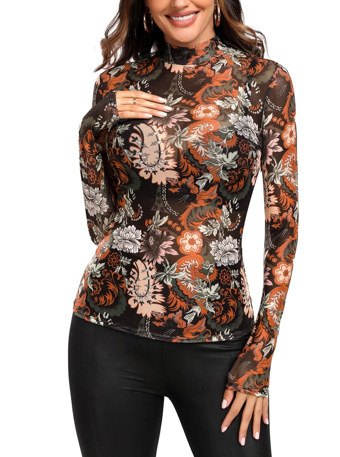 Be the first to review “Floral Mesh Long Sleeve Tops for Women Mock Neck See Through Fitted Sexy Going Out Top” Cancel reply