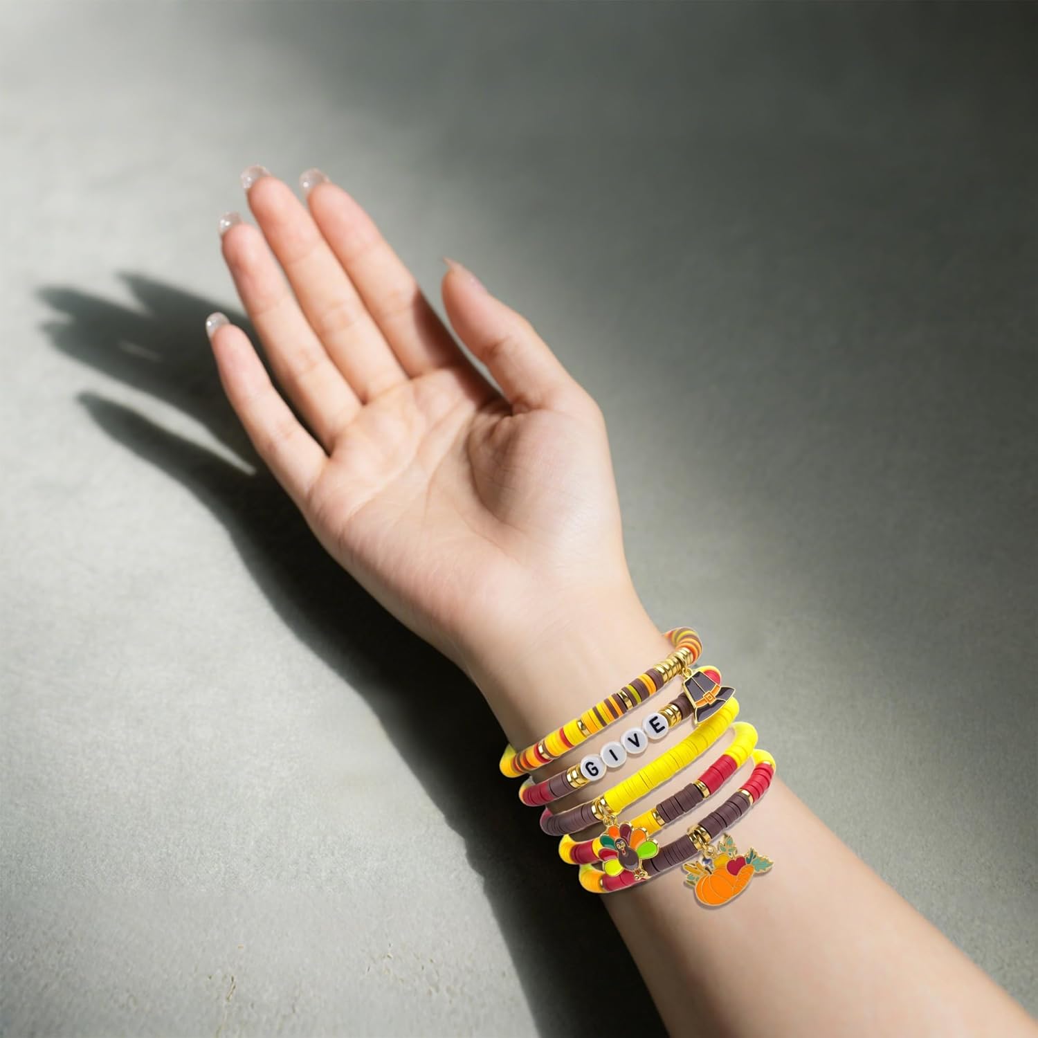 [Elevate Thanksgiving Style]Complete your thanksgiving outfit women with warm – harvest flair! These vibrant bracelets (featuring colors like yellow, red, brown) perfectly complement thanksgiving shirts for women — pair them with fall dresses for women 2025 such as cozy sweater dresses or autumnal maxi dresses. The “GIVE” letter beads, turkey, and pumpkin – vegetable charms add a festive – thankful vibe to your look, while the colorful polymer clay beads echo the charm of fall outfits for women 2025 for instant holiday charm.