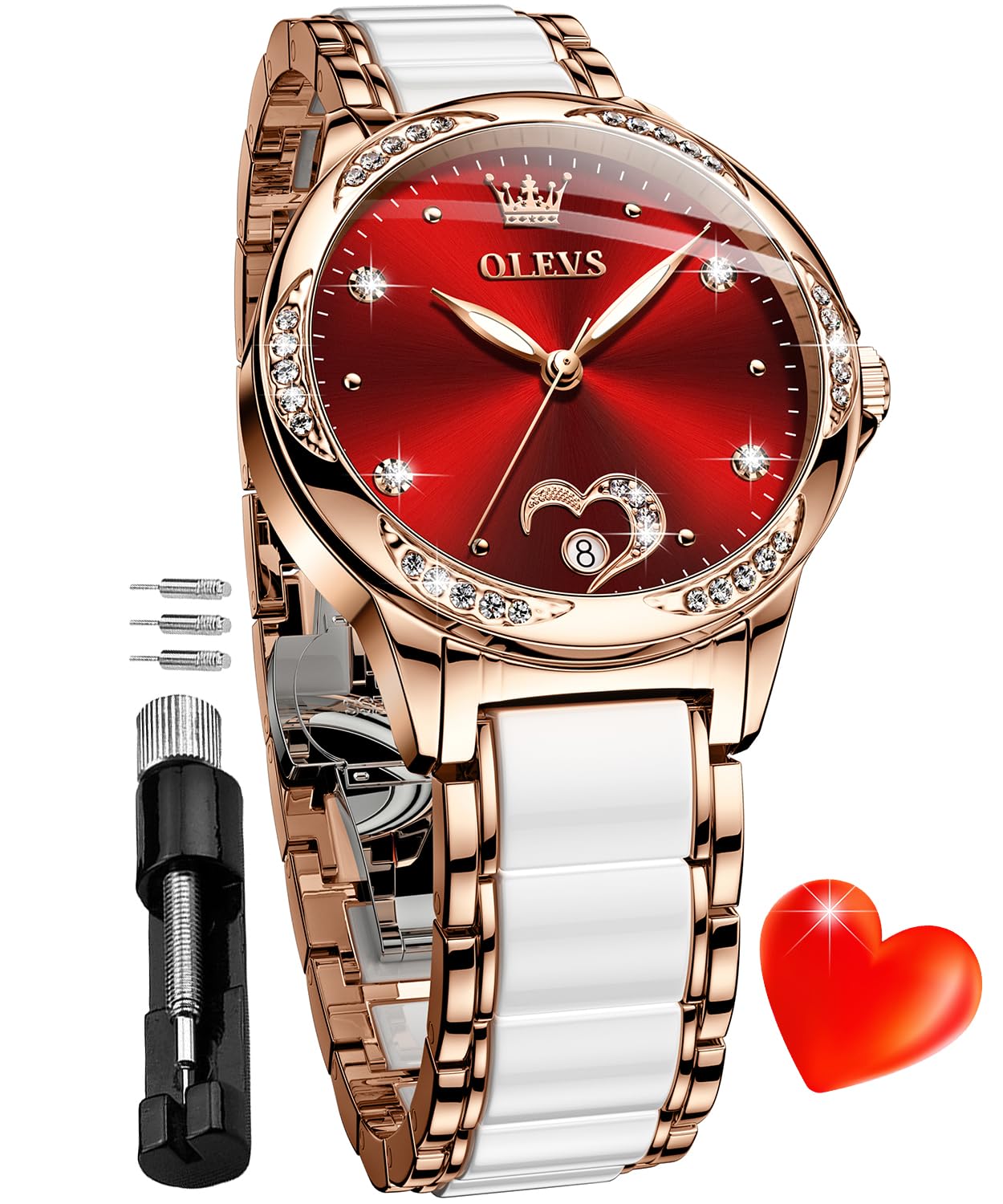 ๐ Ladies Self-winding Watch: Gorgeous diamonds scattered on the case, and the romantic heart-shaped calendar window is even more brilliant. This elegant red watch will definitely give you more charm.
