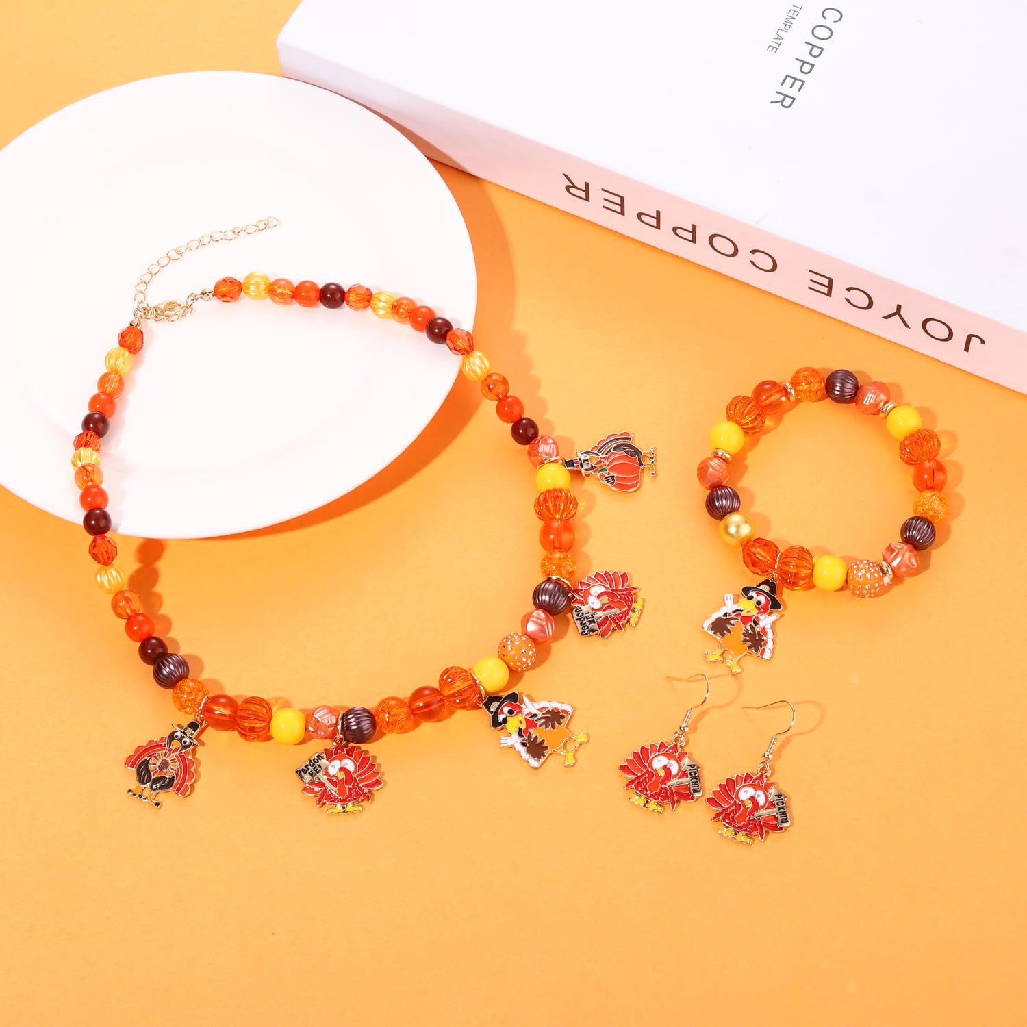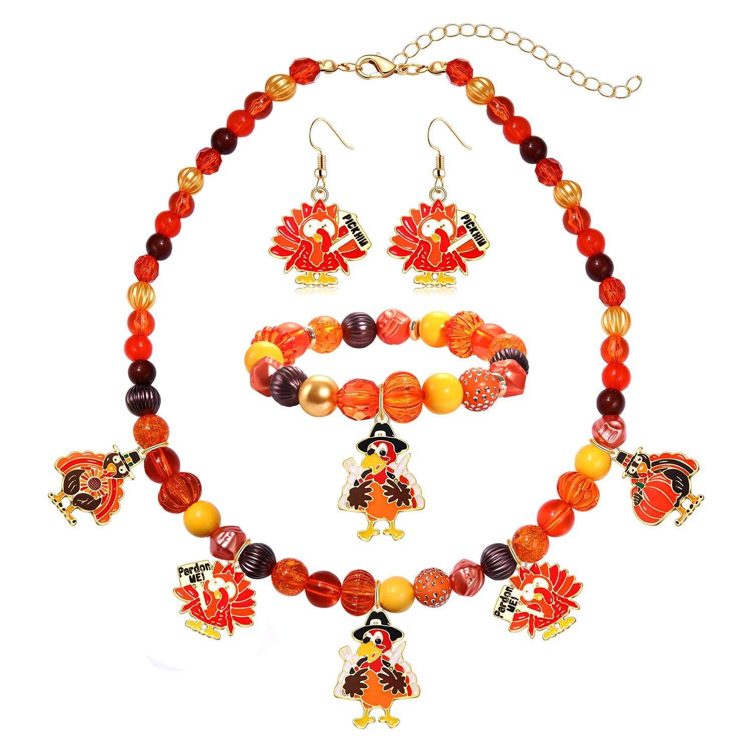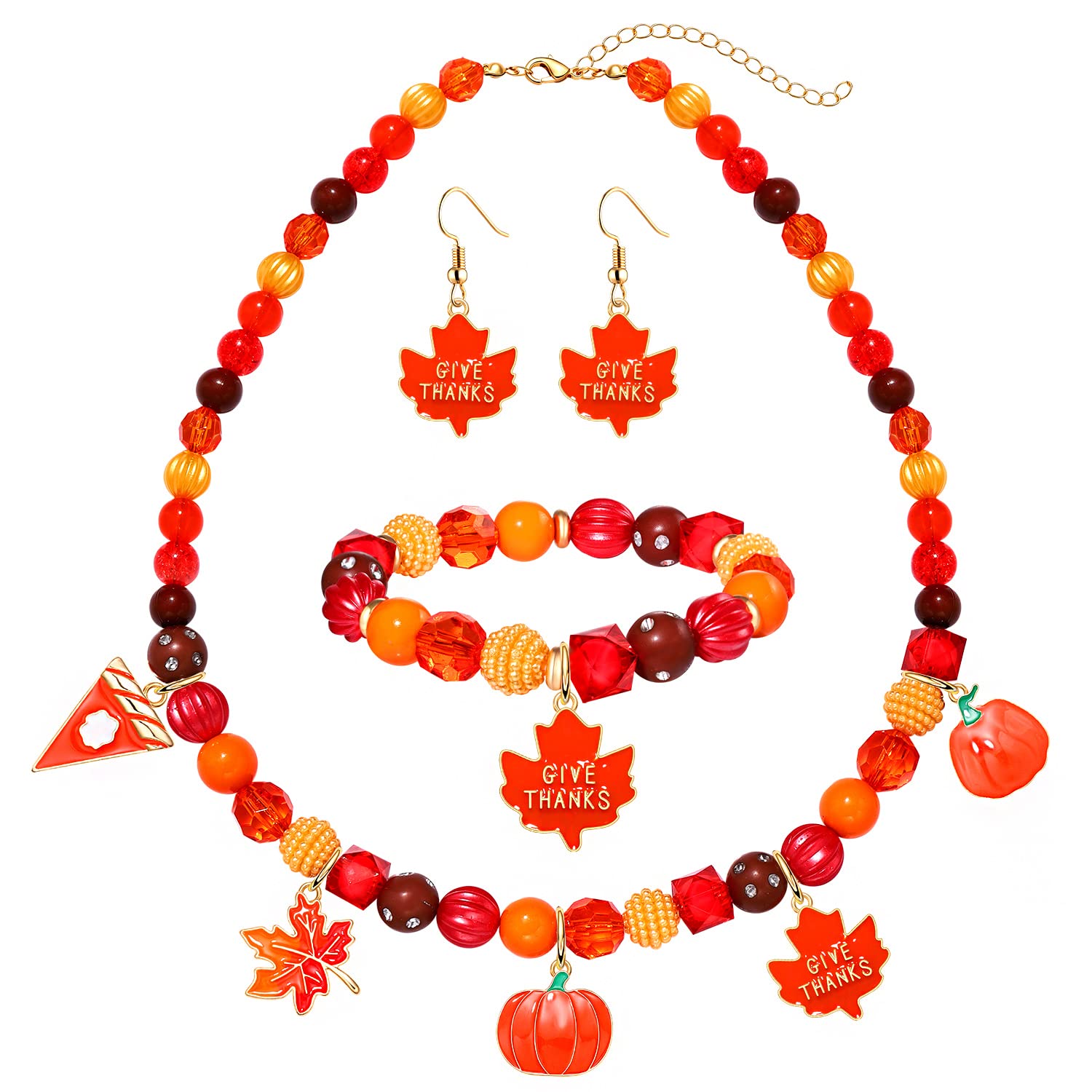 Specification: Thanksgiving Fall Necklace Bracelet Earrings Set, Chunky Pumpkin Maple Leaf Turkey Bubblegum Necklace for Women Beaded Stretch Bracelet Dangle Earrings Holiday Party Gifts