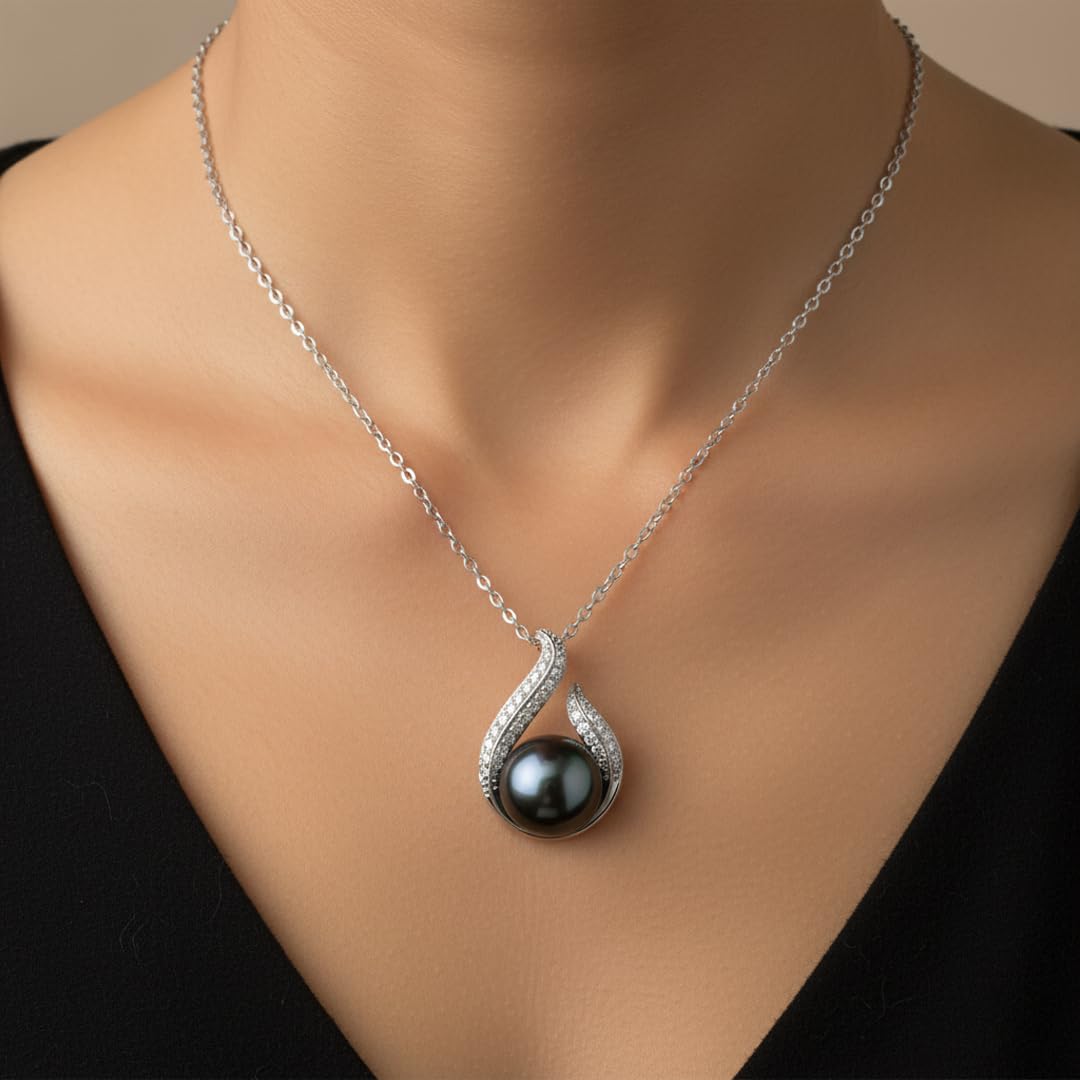 REAL TAHITIAN BLACK PEARL NECKLACE: Stunning 11-12mm AAA-quality round Tahitian Black Pearl mounted on durable Titanium Alloy with thick Rhodium plating, accented by a sparkling Swarovski crystal for lasting shine. Most Tahitian Pearl Jewelry pearls that are identified as “black” are actually show deep green tones with peacock or blue overtones. Each one is unique and truly one of a kind.