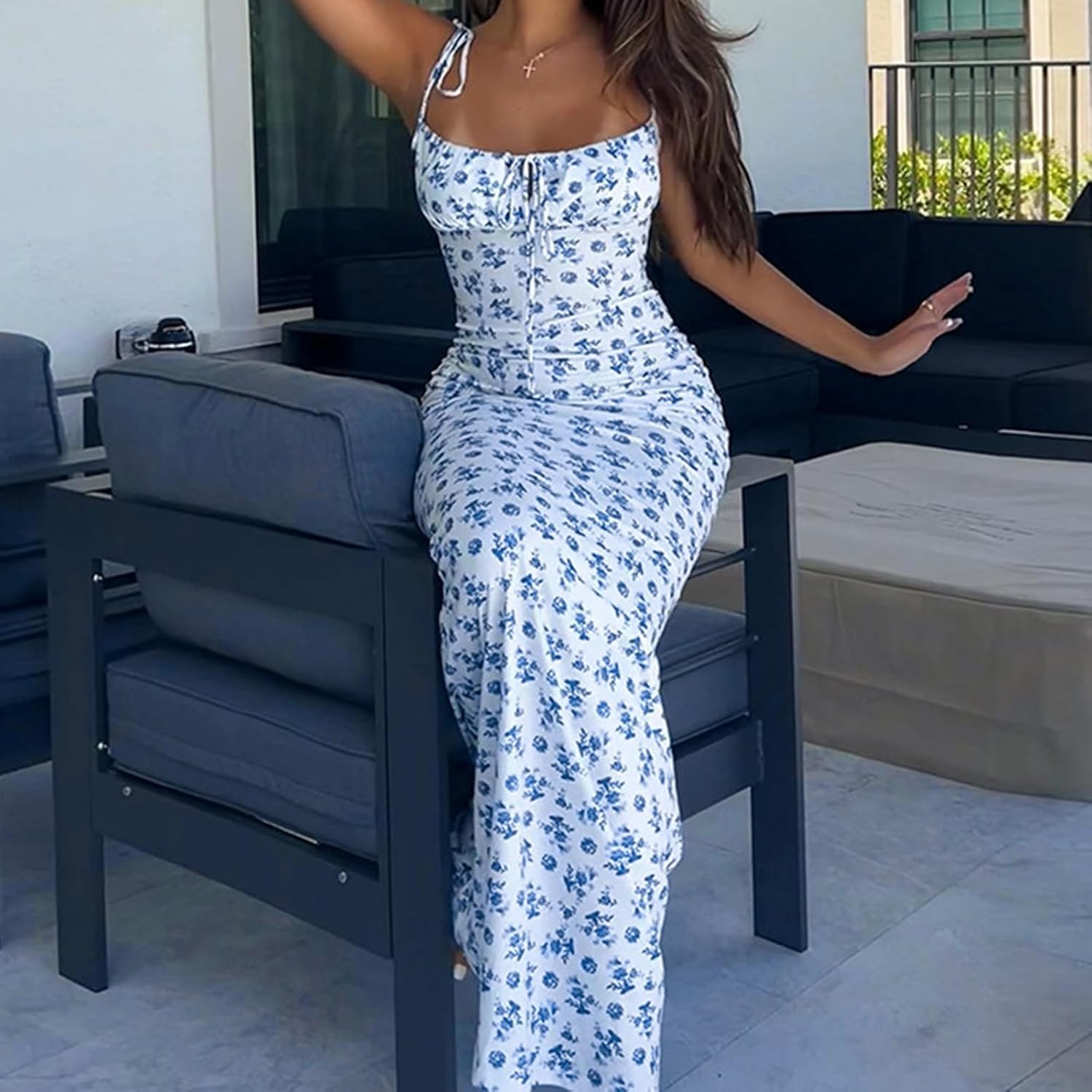 Design: This bodycon maxi dress features a sexy sleeveless design with spaghetti straps and a backless style. The dress also includes a halter V-neckline and tie shoulder straps, adding a touch of elegance to the floral print design