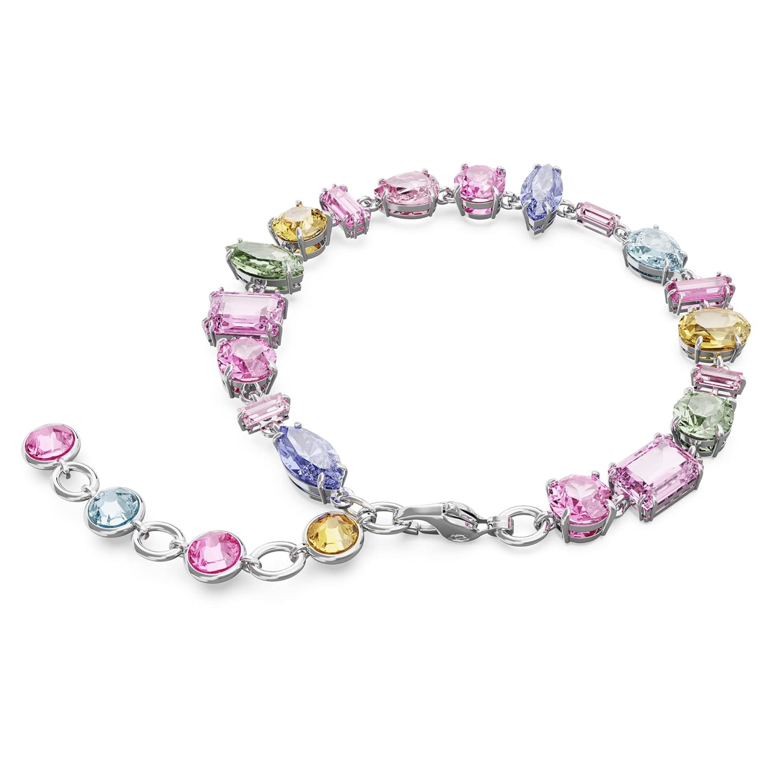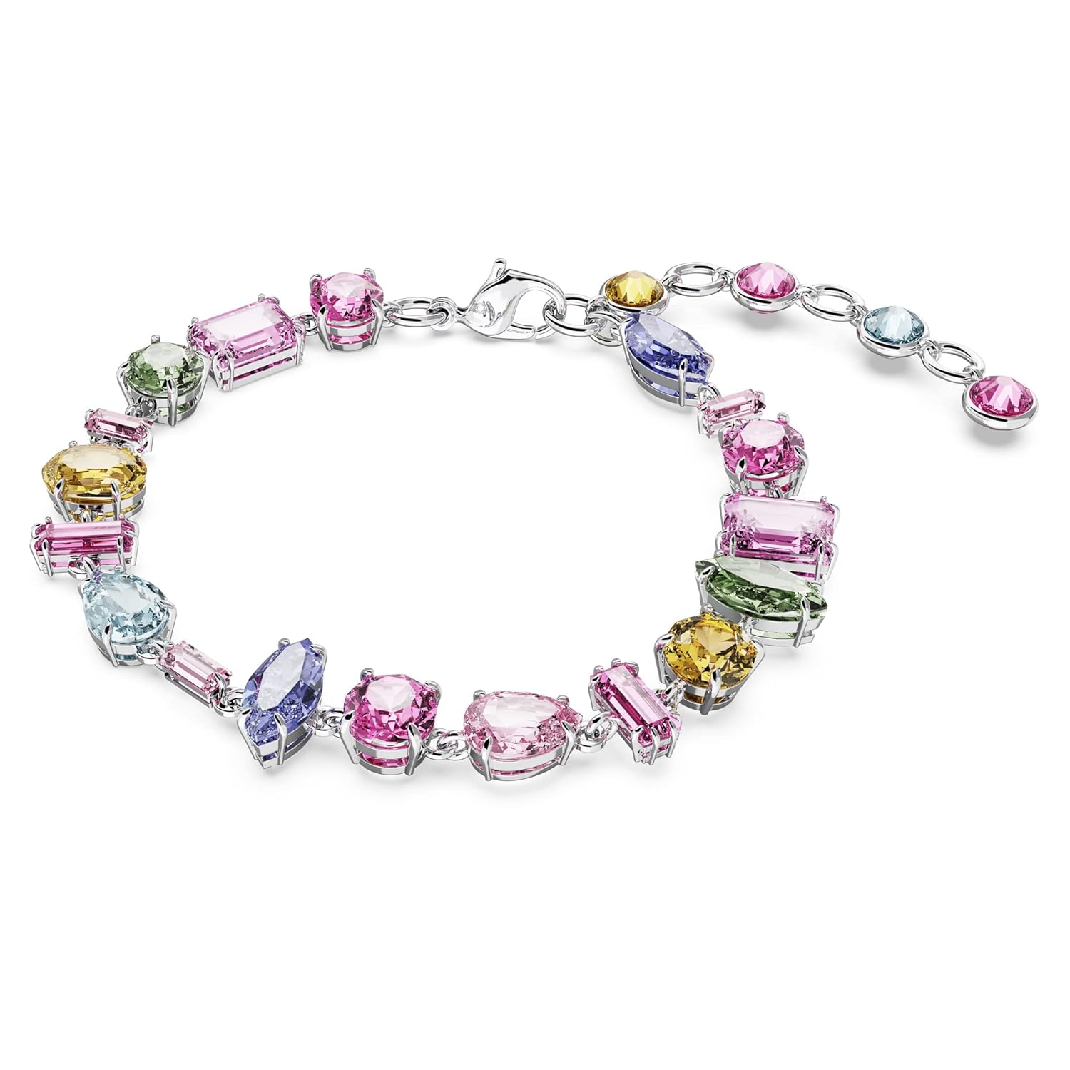 Items delivered: (1) Swarovski Gema bracelet with multicolored mixed-cut stones in a rhodium finished setting, complete with Swarovski bracelet box