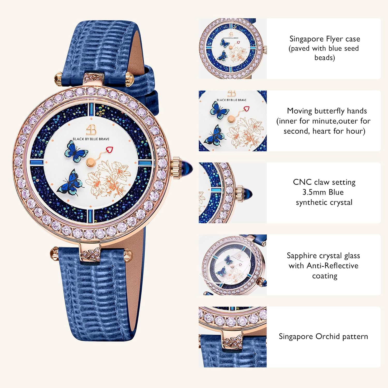 Singapore Flyer-Inspired Case Design: The 34mm rose gold case of these ladies watches for women is set with secure CNC claw-set cubic zirconia stones and blue seed beads, offering a dazzling, architectural look to elevate your butterfly watches collection