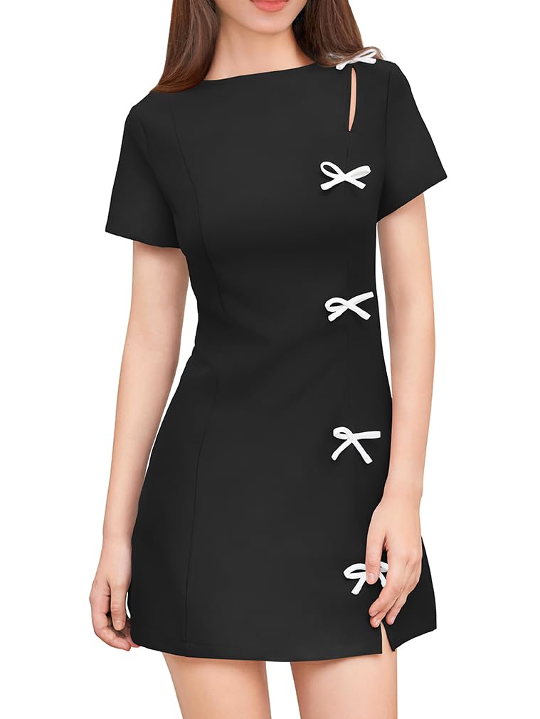 Flattering Design: Short sleeve; boat neck; bow and split embellishments; A-line silhouette; above knee mini length; casual and elegant style. This exquisitely crafted A-line mini dress showcases meticulous attention to detail, featuring an elegant silhouette that gracefully accentuates feminine contours. The thoughtfully tailored design incorporates a gentle boat neckline and concealed rear zipper for effortless wear. And the bow decoration and split details add a touch of elegance